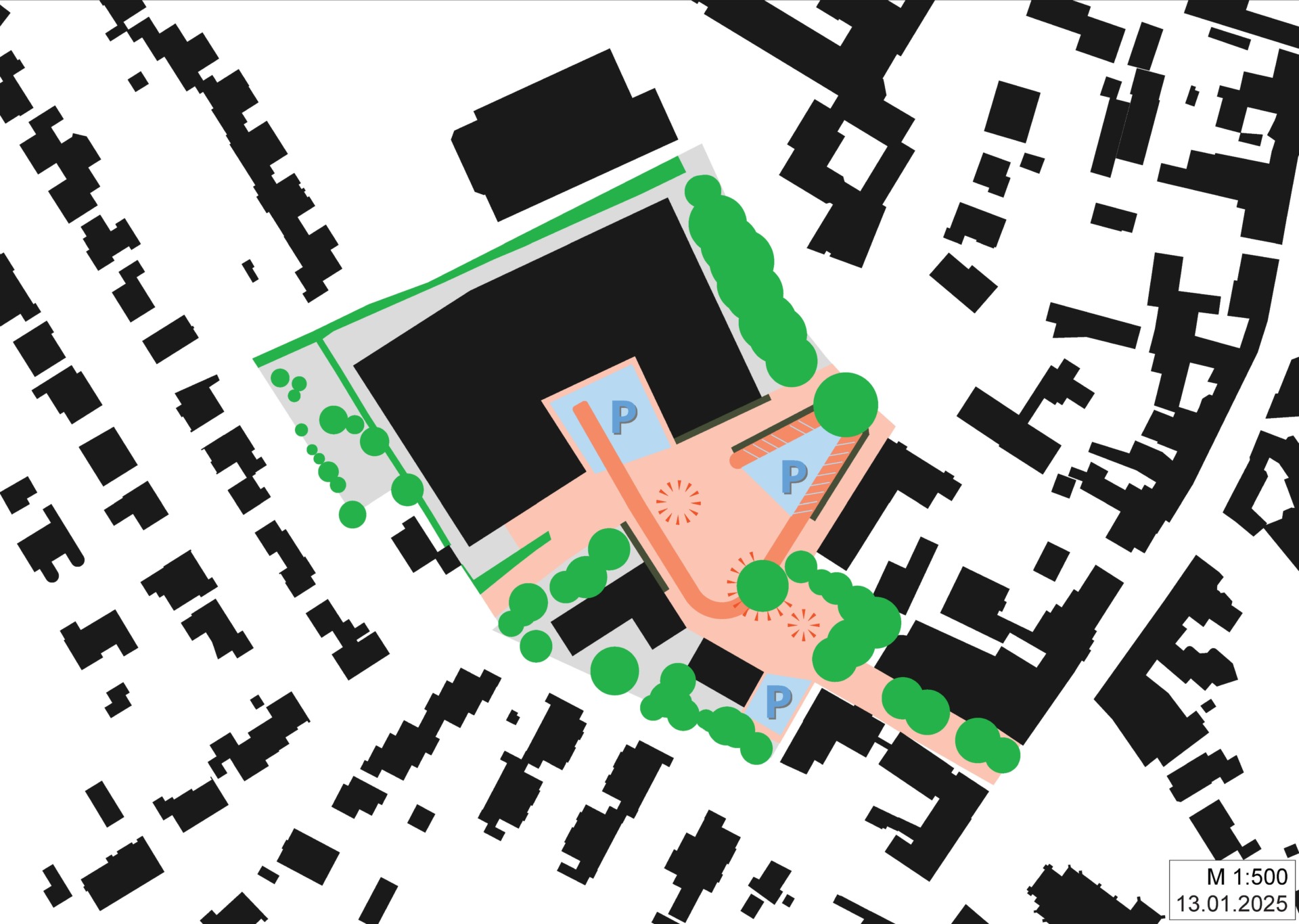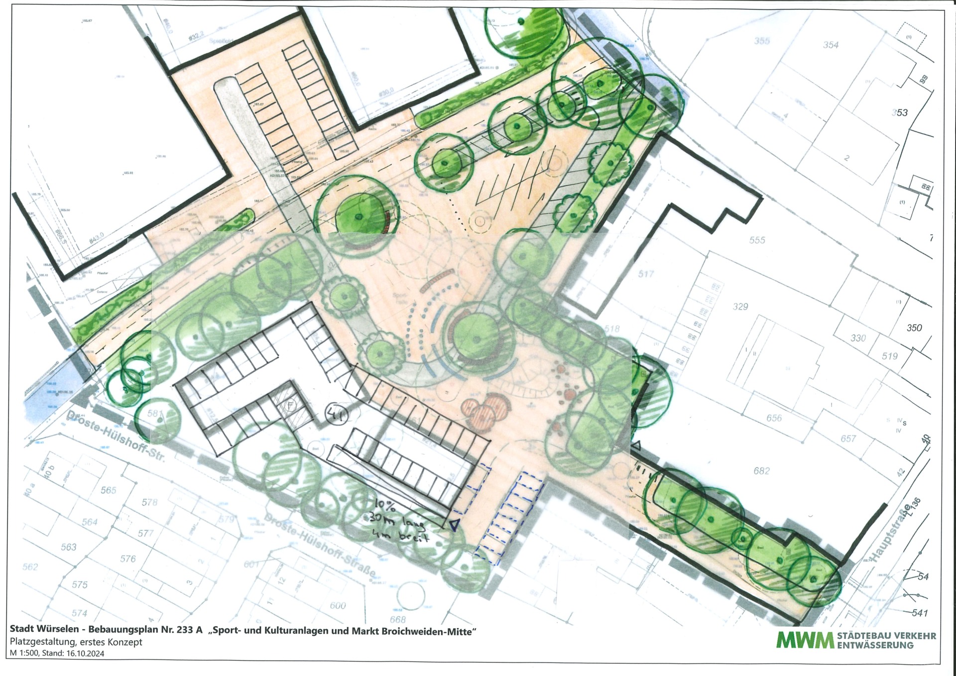 Aus diesen Gründen erarbeitete MWM verfahrensbegleitend unterschiedliche Studien zur Baukörperstellung (Hallenkomplex, Wohn- und Geschäftshaus) sowie ein Erschließungs-/ Freiraumkonzept zur Sicherung der öffentlichen Belange an den zentralen Platzbereich am Broichweidener Markt.