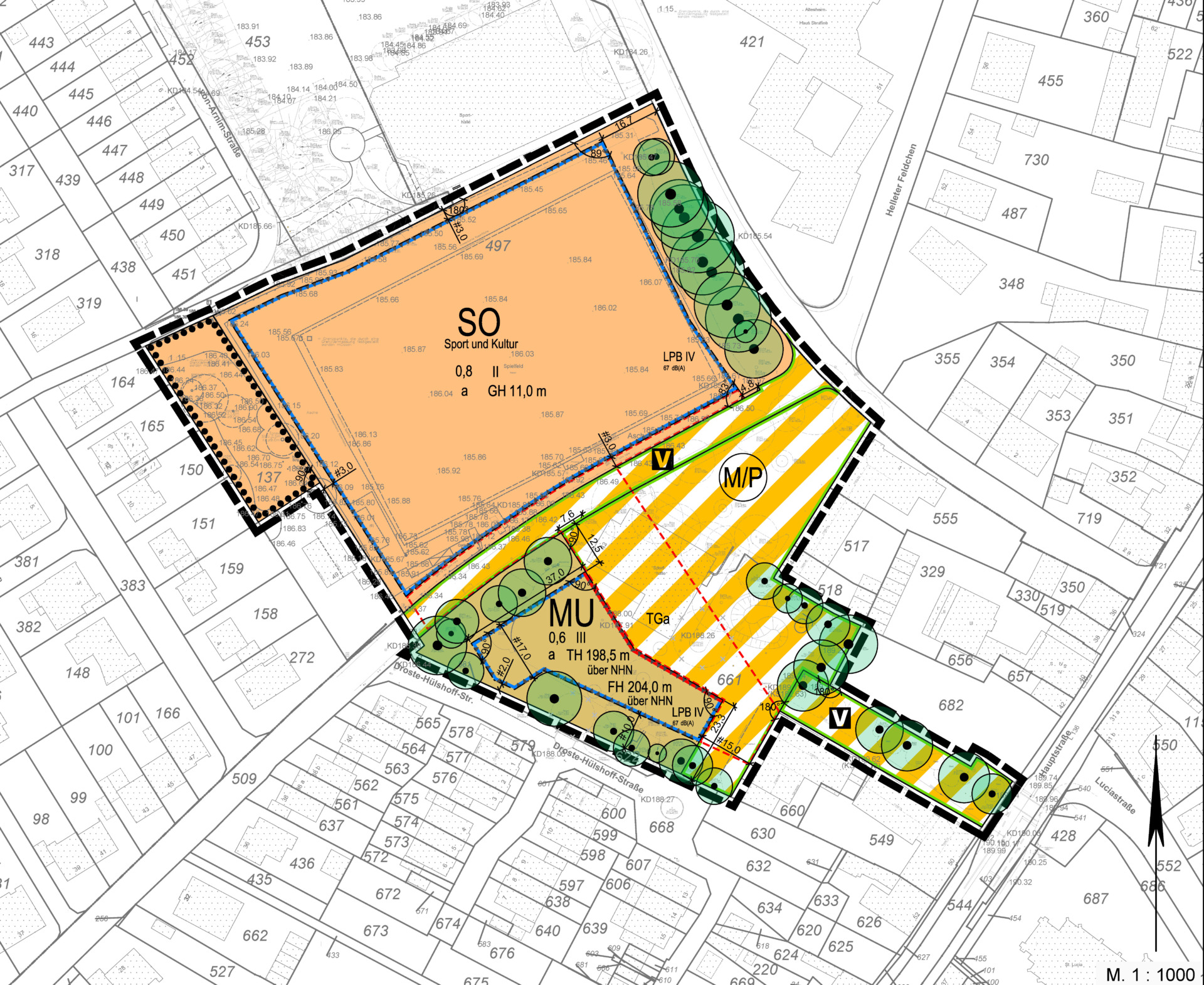 MWM erarbeitete hierzu den Bebauungsplan mit paralleler Änderung des Flächennutzungsplanes und begleitete alle Planungs- und Verfahrensschritte in enger Abstimmung mit den Projektbeteiligten. Dabei bestand die Herausforderung darin, auf engstem zentral gelegen Raum mit hohen Anforderungen an Natur- und Artenschutz, Immissionsschutz, Mobilitätsaspekten, Wohn- und Aufenthaltsqualität den Rahmen für eine auf nachfolgender Ebene umzusetzende Investorenplanung (Hallenkomplex) zu setzen. Kern der Planung war es an zentraler Stelle den dringenden Bedarf der Sport- und Vereinsnutzung zu entsprechen und diesen in Einklang mit den sonstigen Planungsbelangen zu bringen.